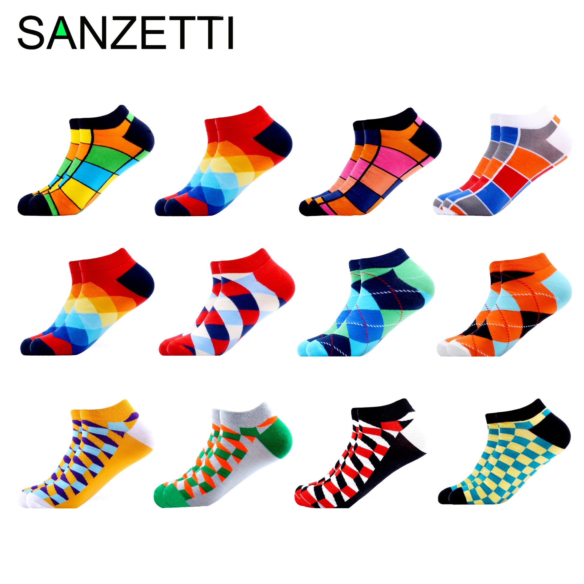 SANZETTI 12 Pairs/Lot Men's Ankle Socks Casual Novelty Colorful Summer Happy Combed Cotton Short Socks Plaid Dress Boat Socks